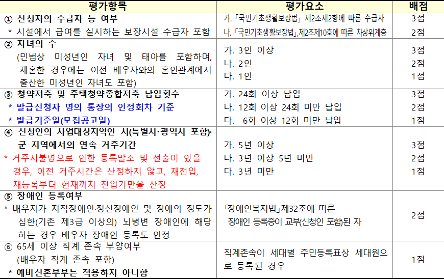 | 3순위 | 제1순위와 제2순위에 해당하지 않는 사람 중 6세 이하 자녀가 있는 혼인 가구 |