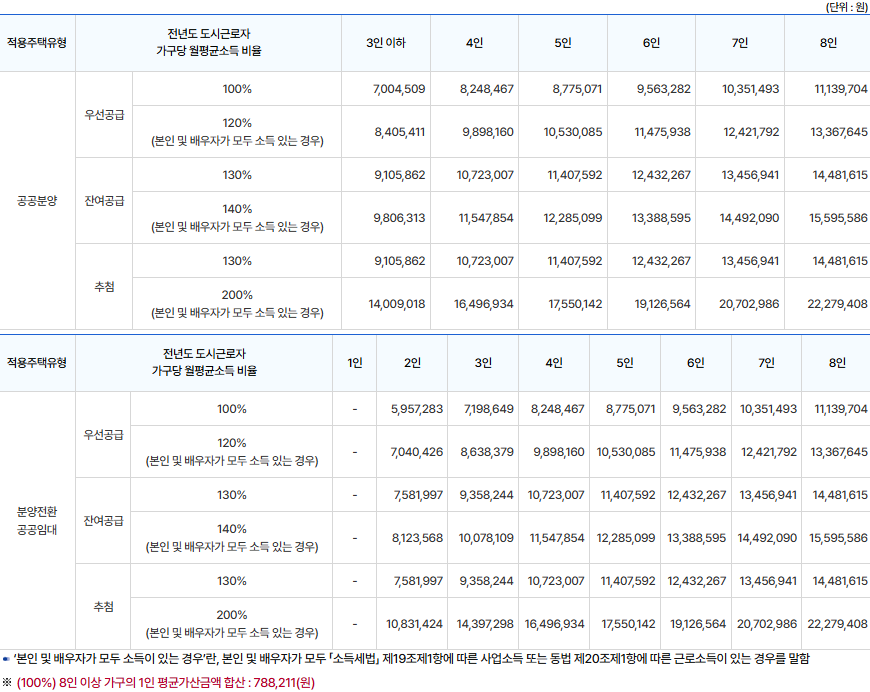 ③ 무주택세대구성원 전원 (예비신혼부부의 경우 ‘혼인으로 구성될 세대’의 세대구성원 전원)의 도시근로자 월평균소득이 130% (단, 본인 및 배우자가 모두 소득이 있는 경우 200%) 이하인 분