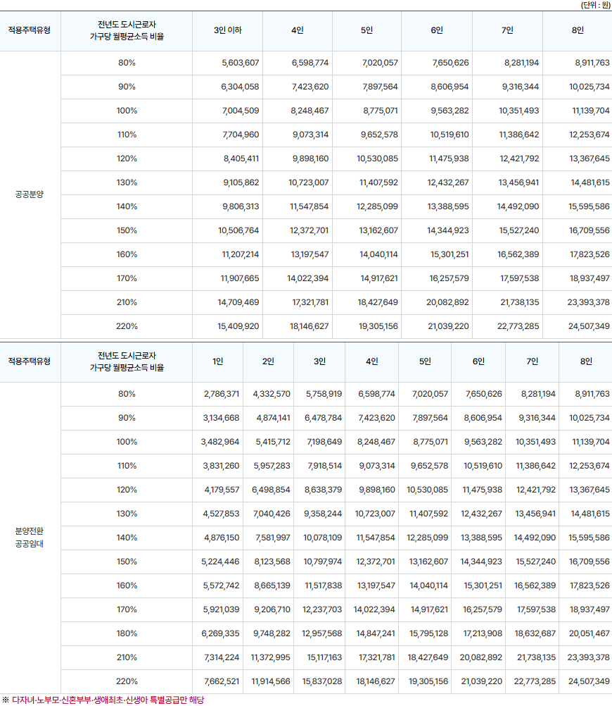 공공분양주택 입주자모집공고일 현재 입주자 저축에 가입하여 6개월이 경과된 자로서 매월 약정납입일에 월 납입금을 6회 이상 납입하고 2세 미만 (2세가 되는 날을 포함한다.)의 자녀가 있는 자를 포함한 무주택세대구성원에게 건설량의 20% 범위 내에서 전년도 도시근로자 가구당 월평균소득 (4인 이상 세대는 가구원수별 가구당 월평균 소득을 말한다)의 140% (단, 본인 및 배우자가 모두 소득이 있는 경우 200%) 이하인 자에게 특별공급